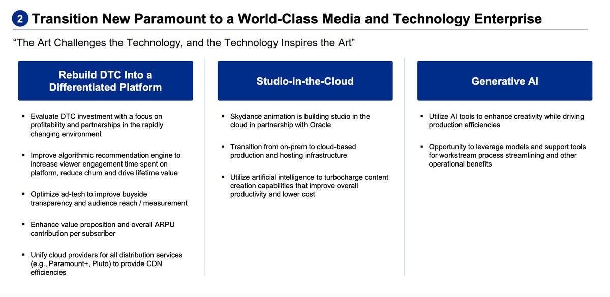 On Monday, likely Paramount acquirer David Ellison told investors “when you look at the landscape as it exists today, there are a lot of technology companies that are rapidly expanding into media companies, and we believe it is essential for Paramount to be able to expand its technological prowess to be both a media and technology enterprise."