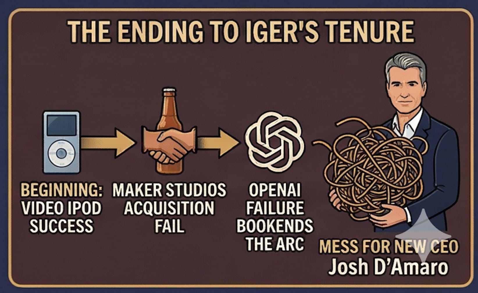 Disney now finds itself fundamentally misaligned with both Wall Street and the broader AI marketplace. It is an unfortunate but poetic ending to Iger’s tenure—beginning with the video iPod, he found success in pivoting Disney’s brand to digital media by using IP as leverage over new technologies.