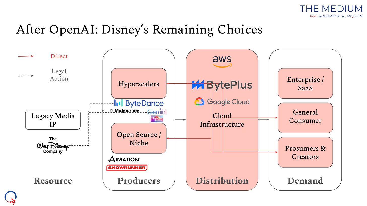 “Disney should focus on finding its Oracle equivalent—a cloud partner with the aligned incentives that come from shared ownership (like the Ellisons have with Paramount and Oracle), providing end-to-end integration from IP licensing through infrastructure to AI tools. Because leverage in the cloud translates into leverage at both the levels of generative AI tools—both from hyperscalers and open source and niche tools—and creators and prosumers using generative AI apps.”