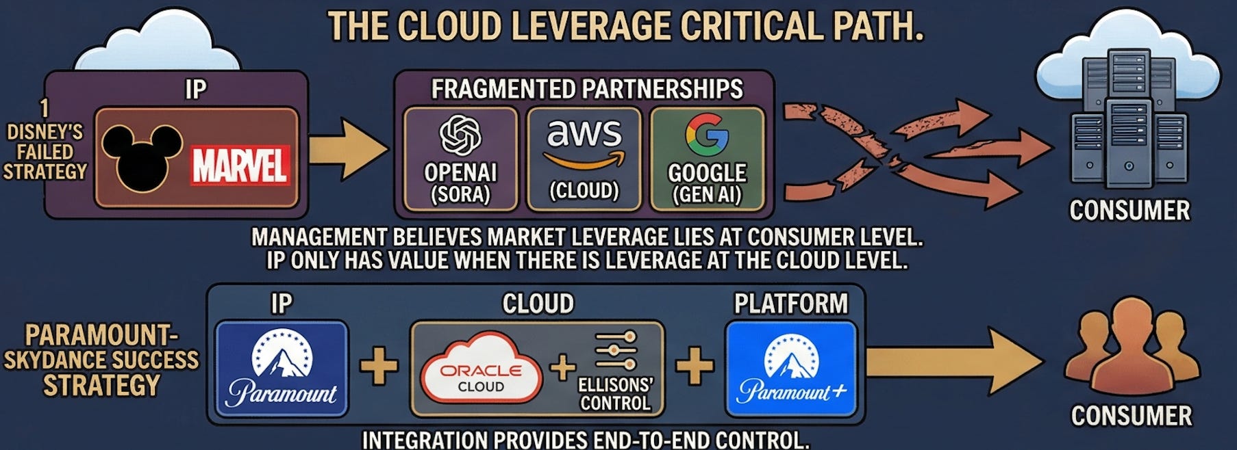 Paramount Skydance and Oracle are quickly moving to build the cloud infrastructure that creates leverage to protect its IP in the AI era. Disney lacks similar available solutions. Instead, it has fragmented partnerships (OpenAI for Sora, AWS for cloud, Google for generative AI) that prevent the end-to-end control which Paramount Skydance achieves through the Ellisons’ control of both companies.