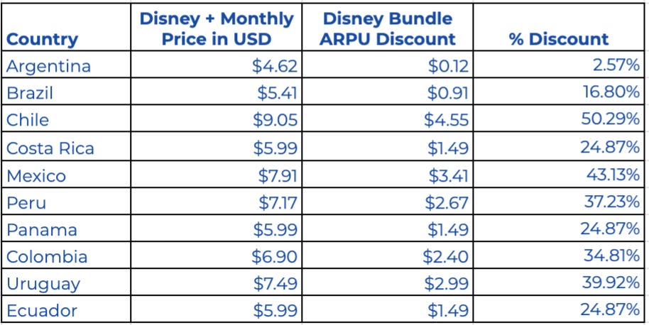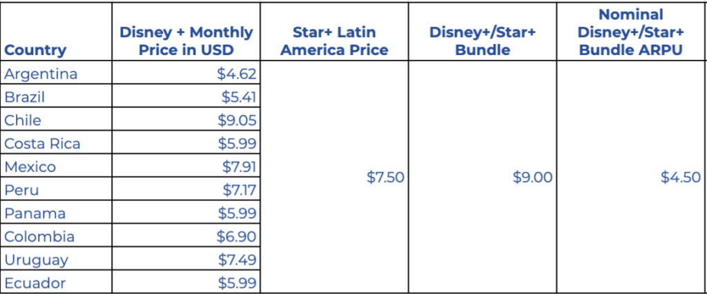 Second, as for Star Plus its bundle with Disney+ is fascinating from a pricing perspective. Disney+, on its own, varies in price across Latin America, adjusted to local currencies: