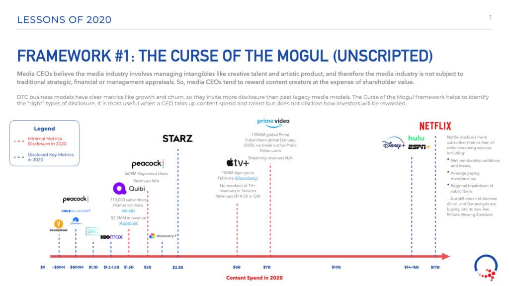 The Curse of the Mogul slide from my 2020 Lessons, 2021 Predictions is, in one way, a basic overview of transparency across the streaming marketplace. Prime Video was marked as a company which disclosed few metrics in 2020 (above).