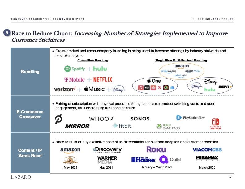 A recent Consumer Subscription Economics Report from Lazard provided a helpful summary on “aggregator 2.0” bundles in the marketplace, highlighting “Cross-Firm Bundling” and “Single Firm Multi-Product Bundling”, in particular.