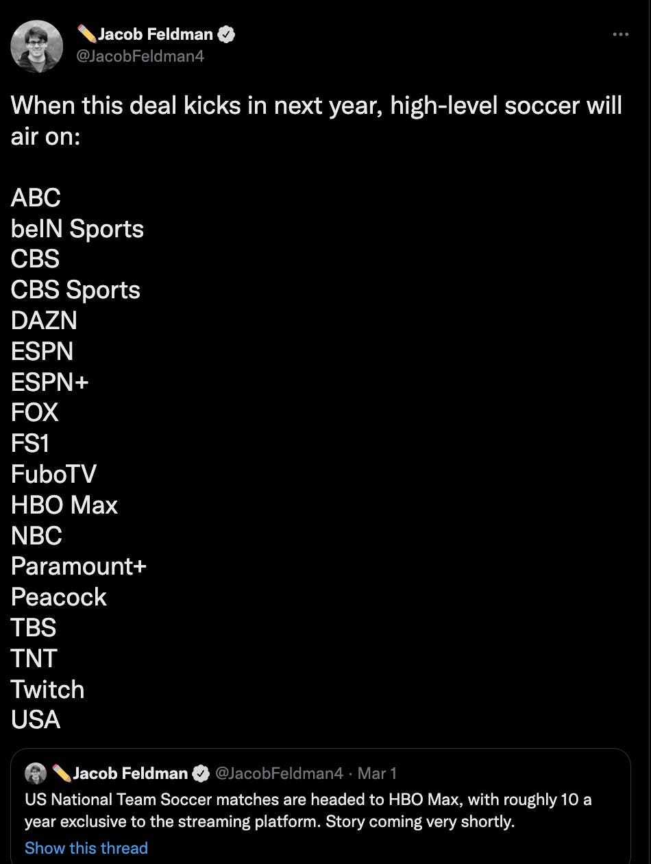 [1] The current status of soccer distribution rights in the U.S. are generally an obstacle to "aggregate audience"as this tweet highlights: