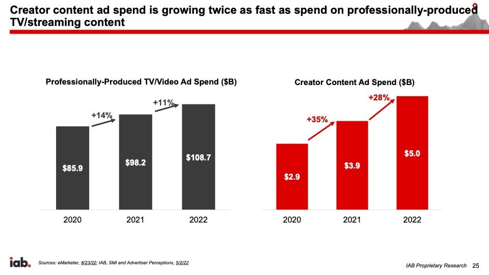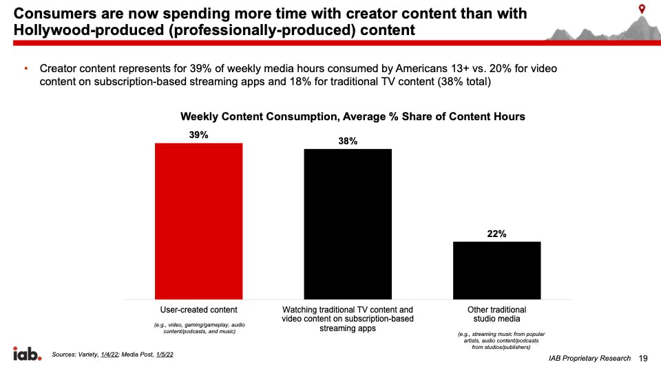 First, consumers are now spending more time with faster, cheaper and sometimes better creator content than more expensive professionally-produced content. And, second, advertisers are quickly shifting budget to user-created content.