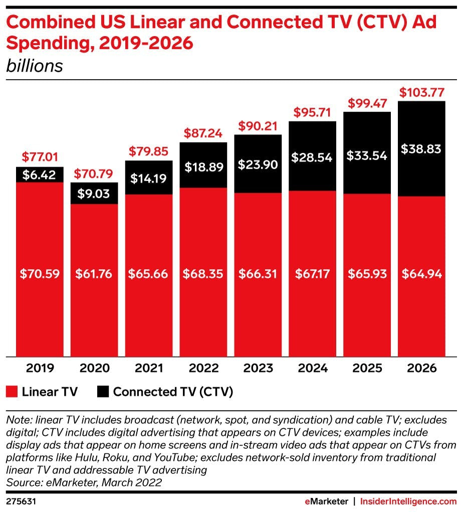 Emerging trends in advertising spend reinforce this point. They have historically spent between $60B and $70B per year in the linear TV ad market over the past few years. Now, with CTV, they are beginning to shift spend, as a recent eMarketer graph highlights.