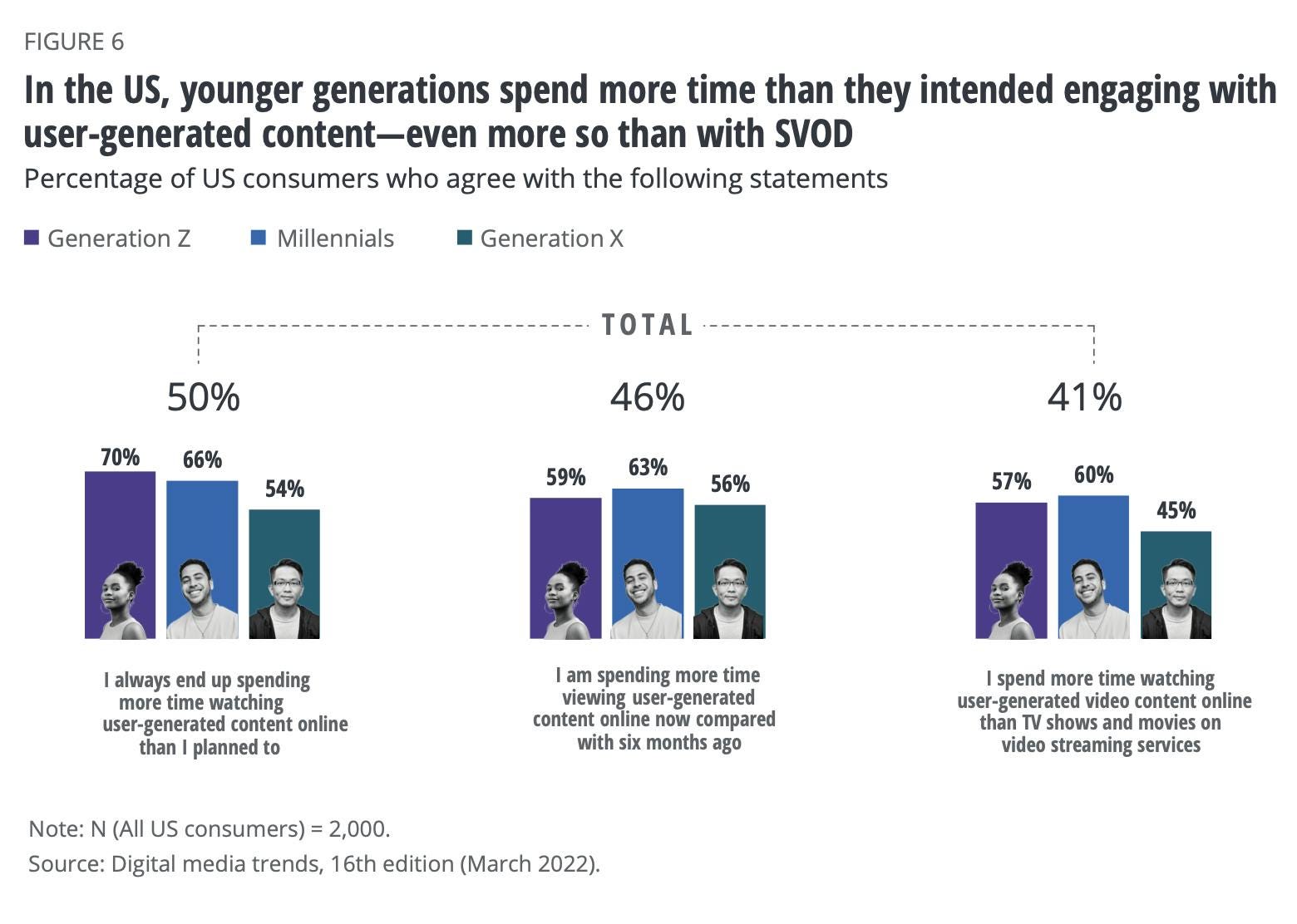 But there is another data point worth considering: ~60% of Gen Z and Millennials say they watch user-generated video content than they do TV shows and movies on video streaming services.