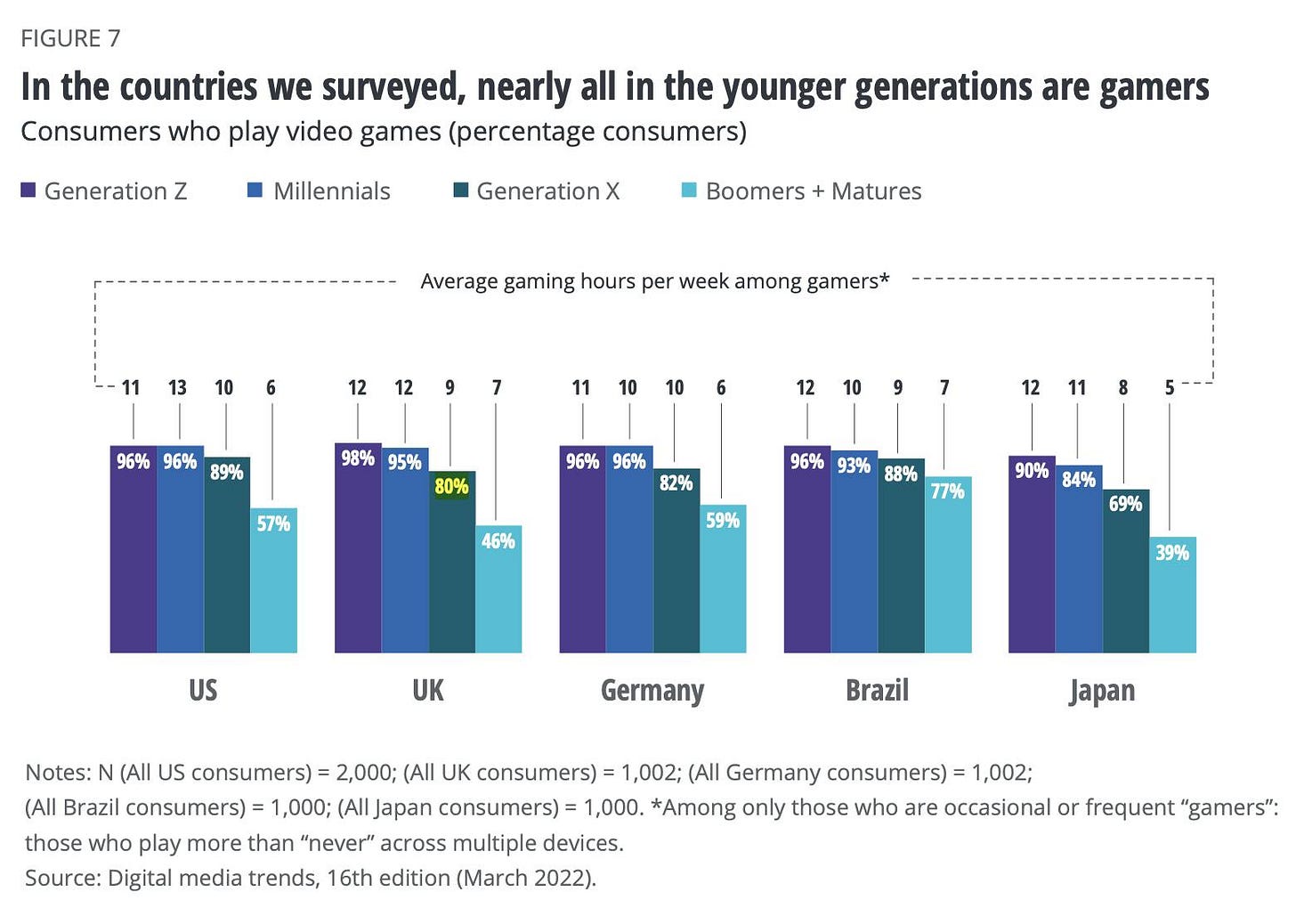 The Deloitte survey showed that over 80% of both men and women in the U.S. say they play video games, and half of the smartphone owners say they play on a smartphone every single day. Gen Z and Millennials game the most, logging an average of 11 and 13 hours of gameplay per week, respectively. In all countries Deloitte surveyed, nearly all younger generations are gamers.
