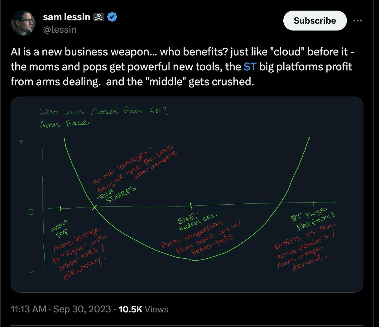 Slow Ventures General Partner Sam Lessin recently argued this dynamic will play out in AI on The Informations’ More or Less podcast and later fleshed it out in a diagram: