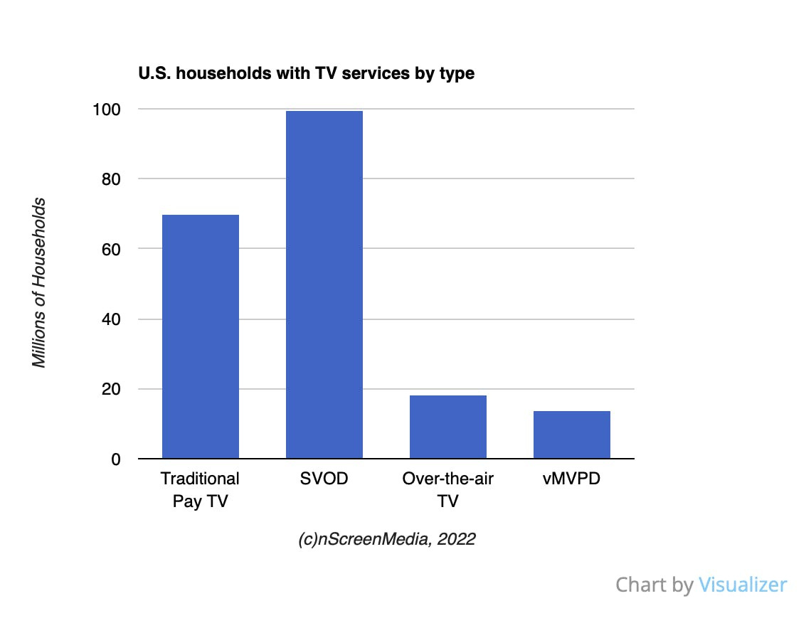 First, there is basic math that explains why Disney is releasing Andor across broadcast, linear and Hulu. According to nScreenMedia’s Colin Dixon, as of Q1 2022 there were: