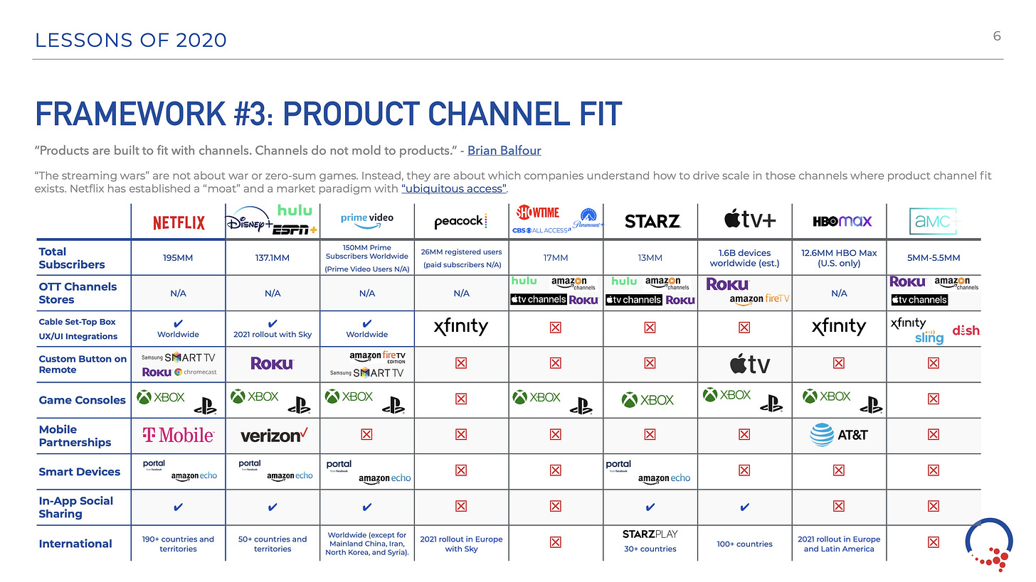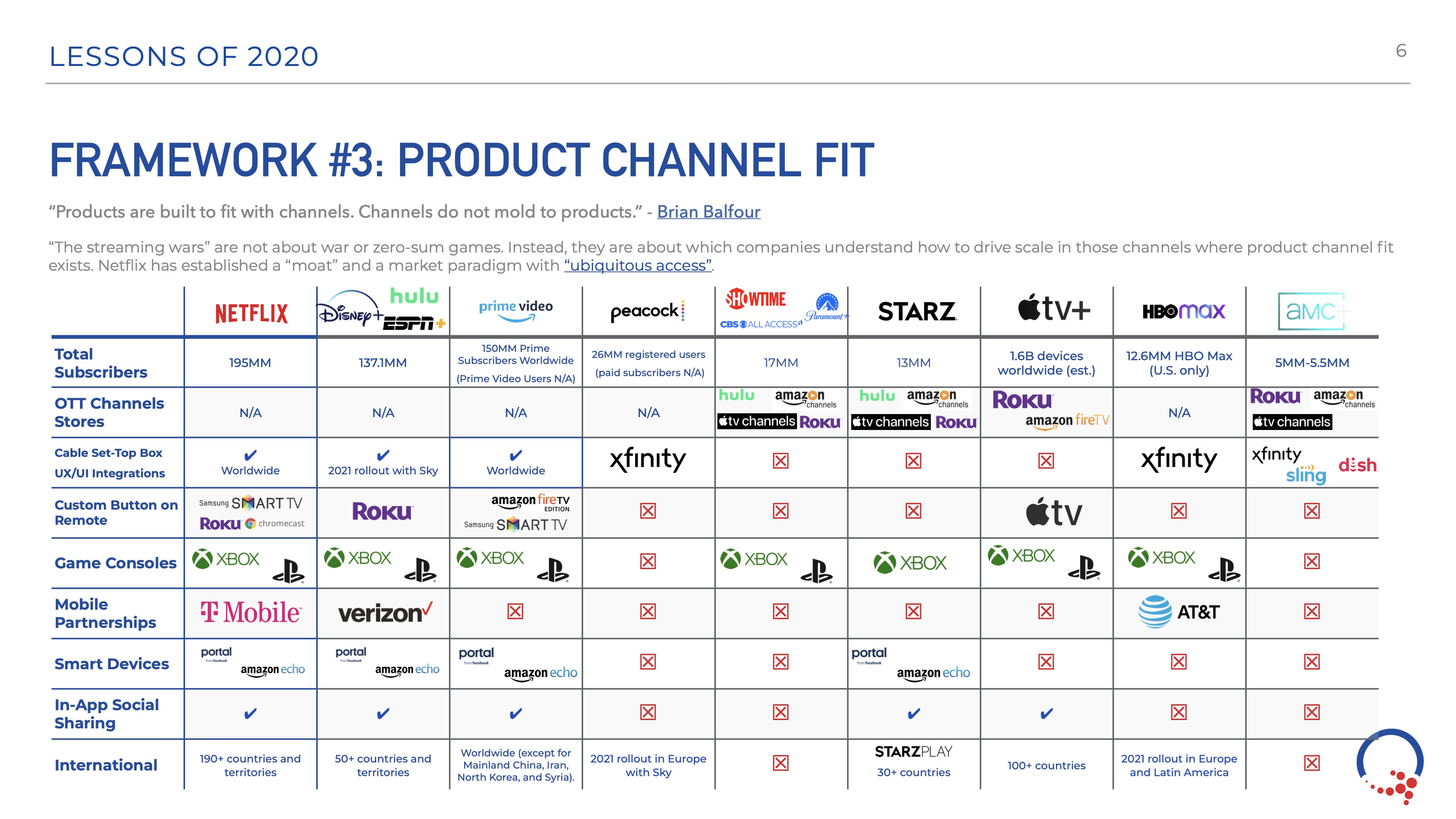 The most interesting element of STARZ’s strategy (and AMC’s) is that it relies most heavily on Product Channel Fit with OTT Channels stores, as you can see in the slide from PARQOR’s Lessons of 2020, below.