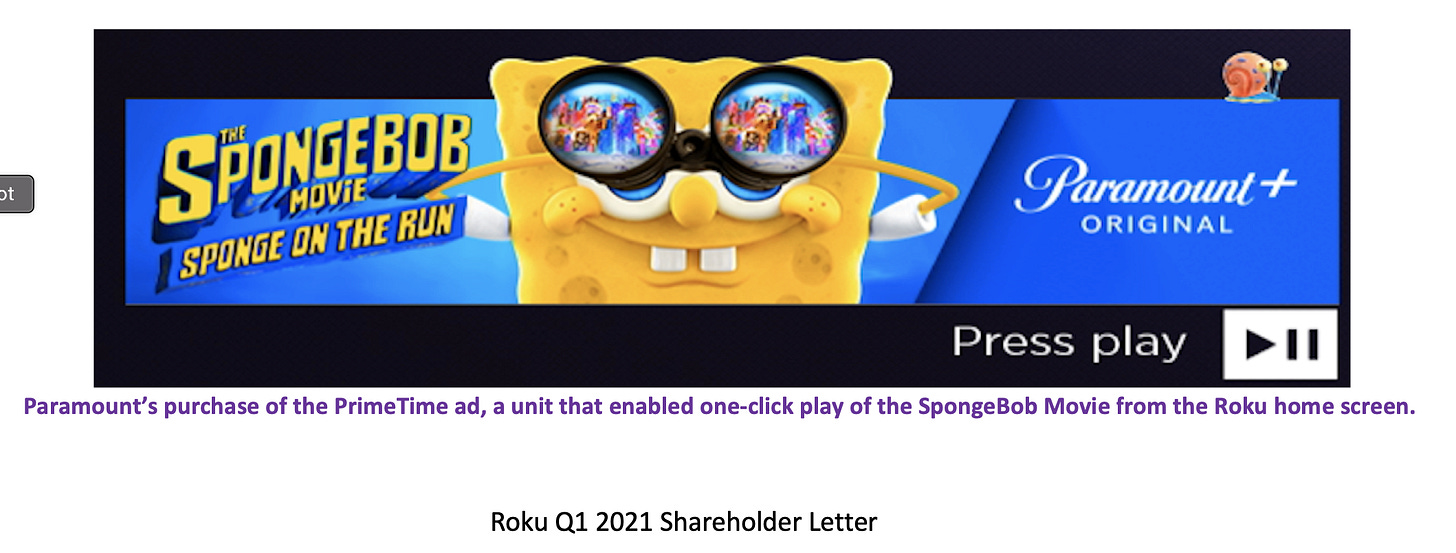 Typically Roku highlights success stories in these letters, so the implication is that ViacomCBS has found product channel fit in the Roku ecosystem, and Roku wants to sell their story. In other words, the success stories ViacomCBS has highlighted for shareholders had Roku to thank for their success.