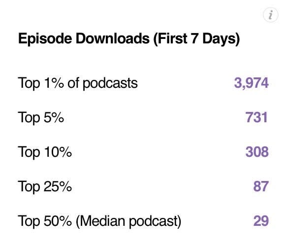 * According to Buzzsprout, 50% of all podcasts only have 29 downloads per episode within 7 days of posting.