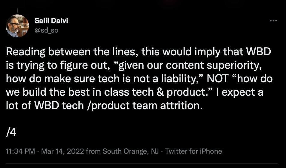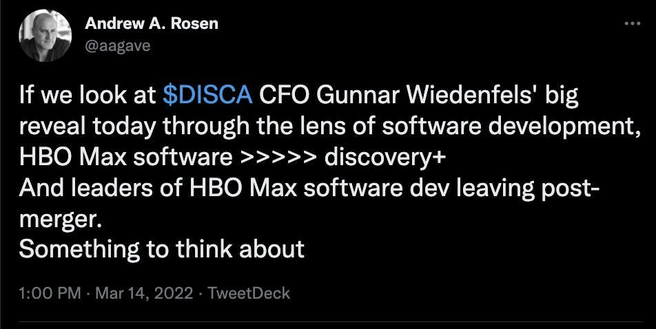First, I had a brief exchange with WarnerMedia CEO Jason Kilar on Twitter, after he responded to my opinion piece on The Information - "A Vibe Shift Is Brewing in Streaming".