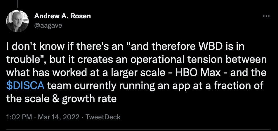 This take suggests that if WBD's management bet on the You.i TV integration over the current discovery+ platform, that approach may end up being more conservative than WarnerMedia's current approach.
