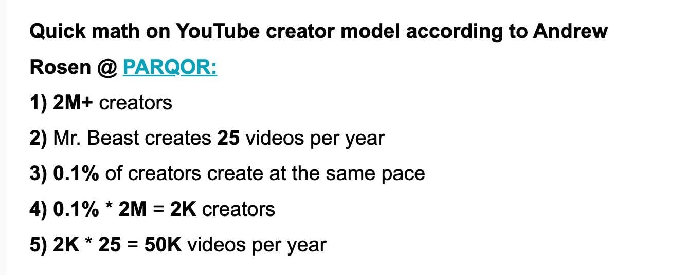 In legacy media TV series terms, that’s 2,000 content creators producing three 8-episode streaming series per year. In Netflix terms, that’s 17K titles (which is around or just over the titles it has in its library worldwide).