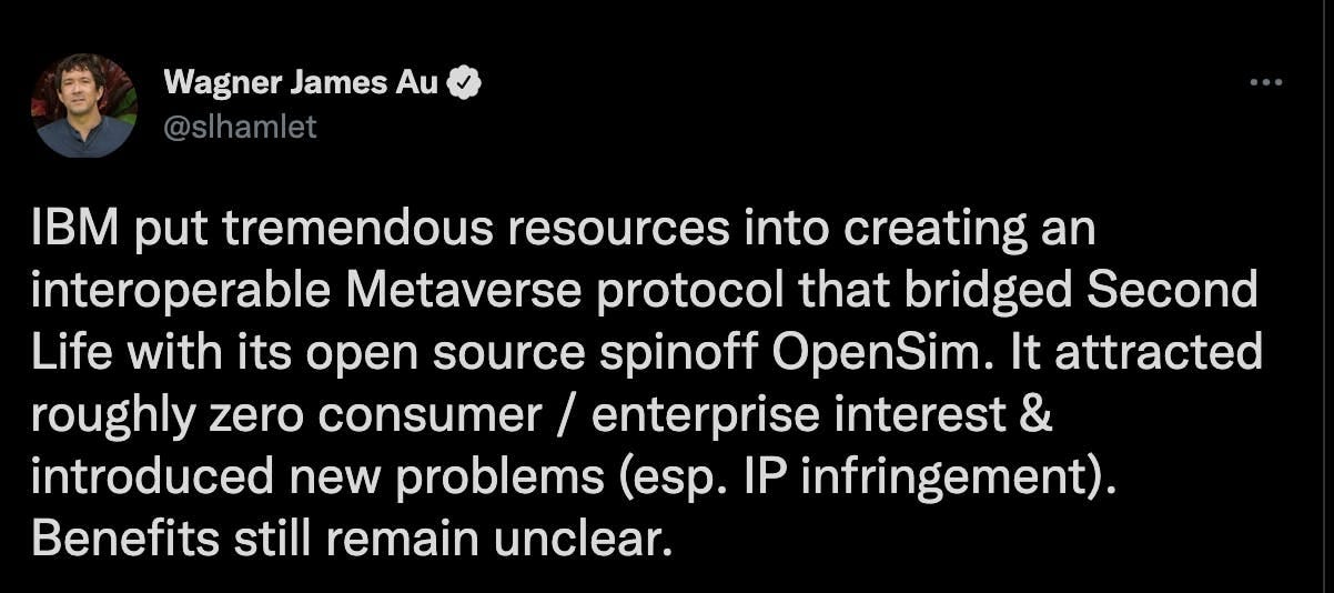 * Will Oremus wrote about the Metaverse in The Washington Post, and how "Meta’s ‘Horizon Worlds’ app, Microsoft and Roblox are capitalizing on a buzzword that’s far from reality". Author Wagner James Au, founder of New World Notes, the longest-running metaverse news/culture site, offered this interesting response about the challenges of Metaverse-type interoperability: