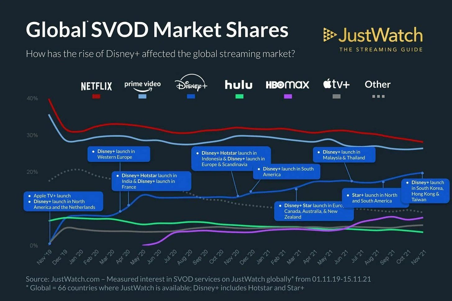 * This timeline provided by JustWatch depicts the global SVOD market shares including Disney+ as it became available in countries throughout the world.