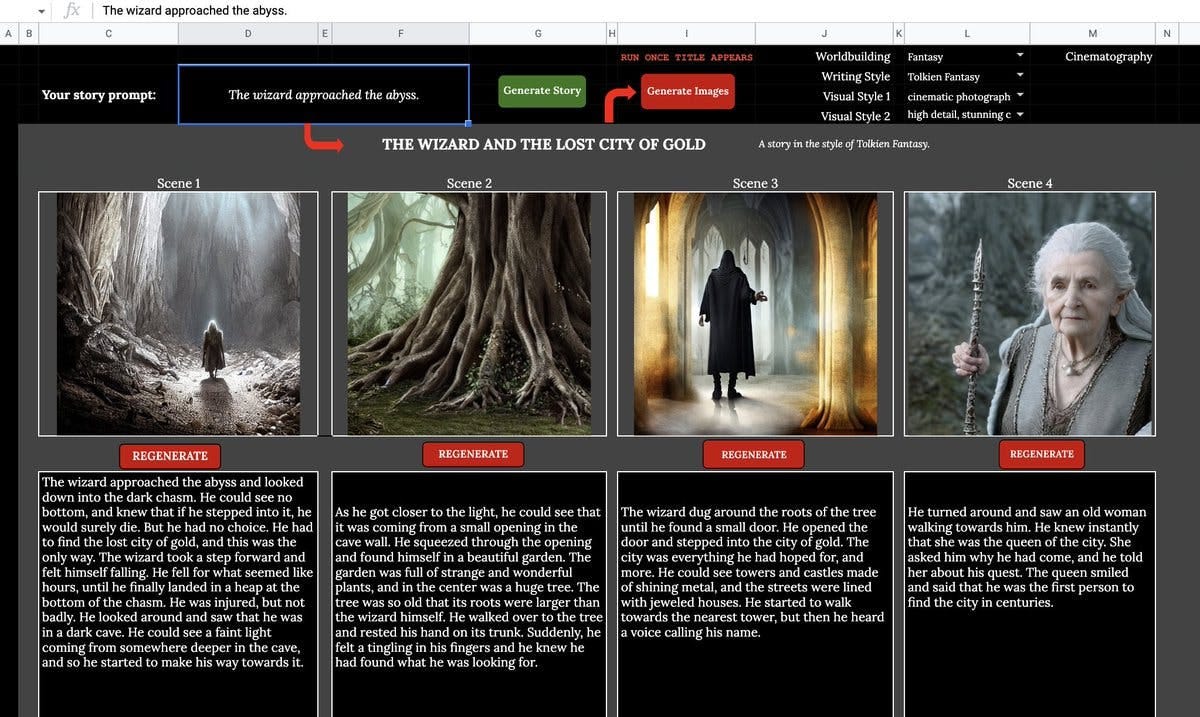 We saw demos for nine different engines and use cases. We ended with Holosheet, where “you input a prompt and the AIs generate story, visuals and a title”. In other words, write a story idea like “The wizard approached the abyss" and the AI generates a storyboard that looks like the one below.