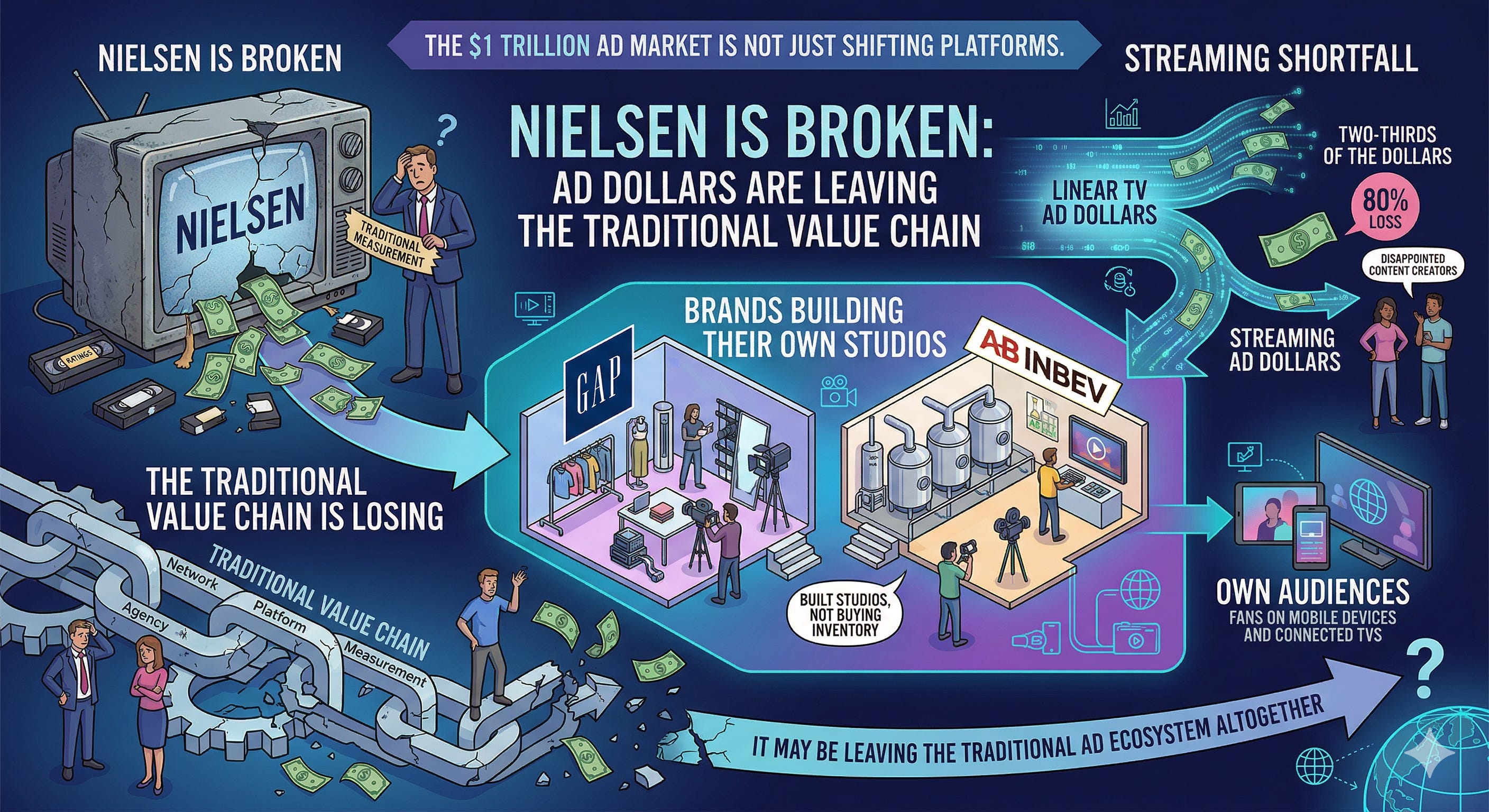 The message from all three different market signals: The traditional media value chain—produce content, attract audiences, sell advertising against those audiences, measure with Nielsen—is collapsing at each node.