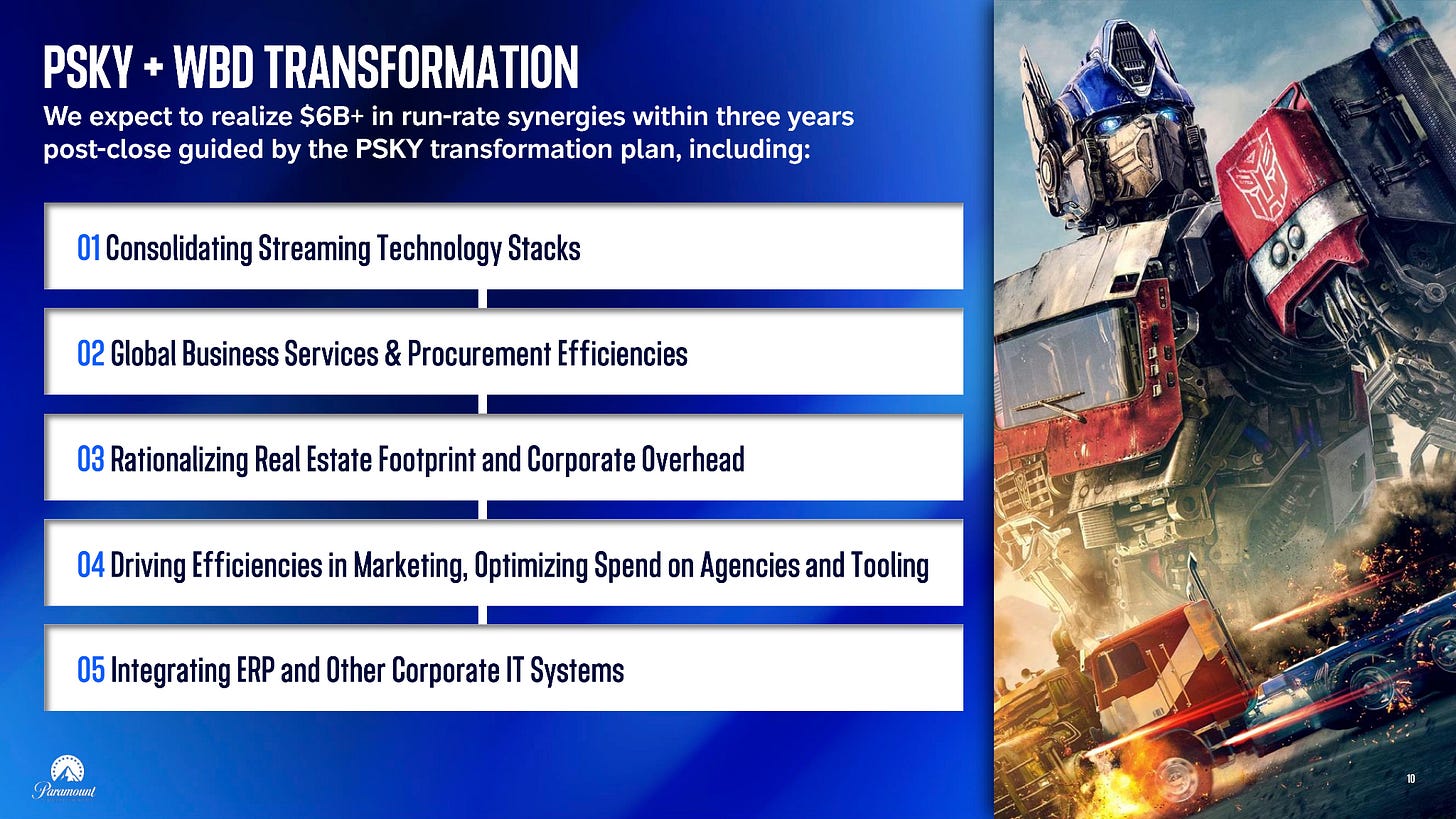 Second, Paramount management spoke to investors about its acquisition of Warner Brothers Discovery. “Consolidating Streaming Technology Stacks” was listed as the first objective for corporate synergies in its investor presentation.