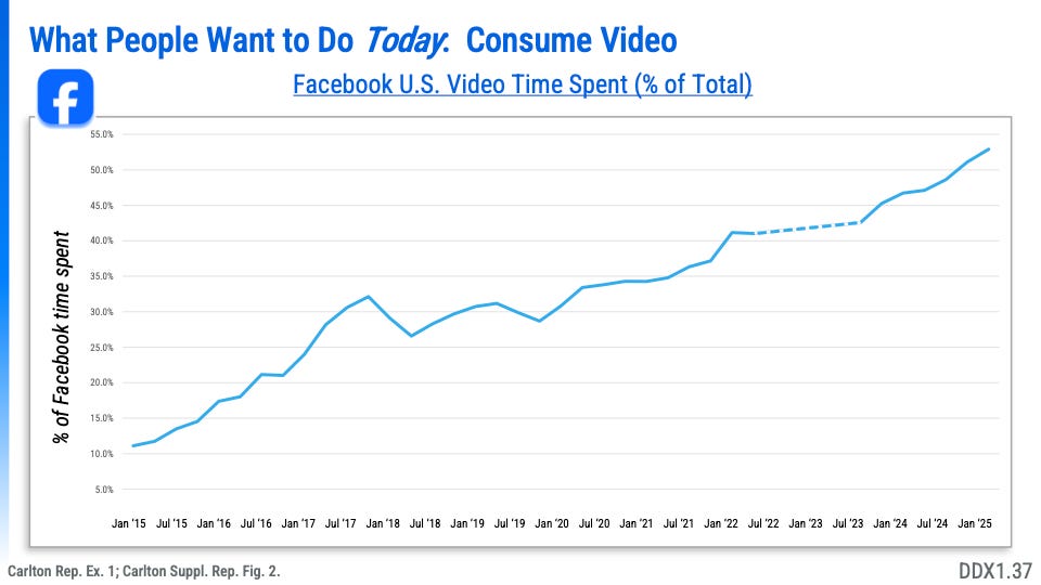 Meta's opening defense included an 88-slide presentation arguing why it doesn't meet the definition of a "monopolist" under U.S. antitrust law. It included this slide on how video drives engagement on Facebook.